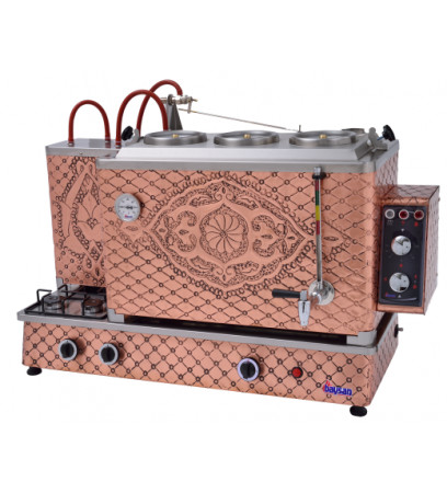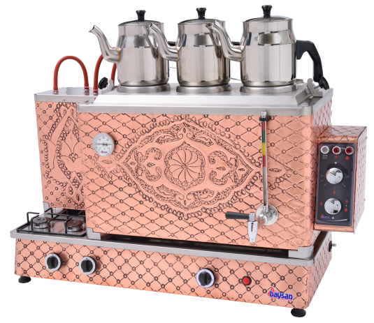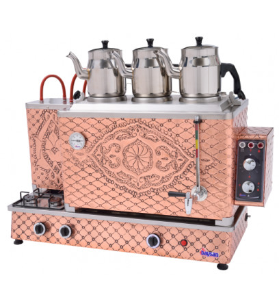 Endüstriyel çay kazanları içerisinde en fazla tercih edilen modellerin başında gelmektedir. Özel işlemeli bakır gövdesi son derece dekoratiftir ve bütün mekanlara uyum sağlar. Günlük tüketimi çok fazla olan büyük işletmeler ve kahvehaneler için son derece uygundur. . Hem elektrikle hemde doğalgaz ile çalışabilme özelliğine sahiptir. Su kazanı ve ocak bölümü tamamen bakır ile kaplanmıştır. CE sertifikasına sahiptir. Avrupa normlarına uygundur. Türkiye'de gaz dağıtım şirketleri üst kurulu olan Gazmer firmasına kayıtlıdır. Gazmer sayfasına girip ürün kaydını sorgulayabilirsiniz. Çay ocağı ve kazanı tamamen bakır ile kaplanmıştır. Farklı modellerdeki 3 demlikli çay kazanlarına buradan ulaşabilirsiniz.
