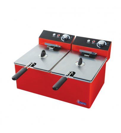 Çift hazneli patates ve tavuk kızartma makinası 5 + 5 litre olarak üretilmiştir. Fritözün yağ hazneleri 2 adet 1/2 gastronorm küvetten oluşmaktadır. Elektrik ile çalışır. Tavuk kızartma makinasının gövdesi ve kontrol paneli kırmızı fırın boyalıdır. Temizliği ve bakımı son derece kolaydır. CE normlarına uygun olarak üretilmiştir. Isıtıcı rezistanslar elektrikli termostat kontrollüdür. Arzu edilen sıcaklık derecesi termostat göstergesi üzerinden ayarlanarak kullanılır. iki haznede birbirlerinden bağımsız olarak ayrı ayrı kullanılabilmektedir. Kullanım kapasitesi yüksek olan işletmeler için son derece uygundur.
