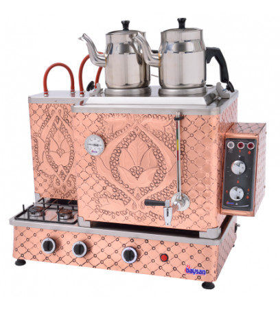 Bakır çay kazanı 2 demlikli olarak üretilmektedir. Makinanın ocak bölümü LPG ile çalışır. Bakır kazan içerisinde elektrikle çalışan rezistans mevcuttur. Hızlı bir şekilde su almak istendiği taktirde hem elektrik hemde gaz aynı anda çalıştırılarak kullanıma hazır hale getirilebilir.